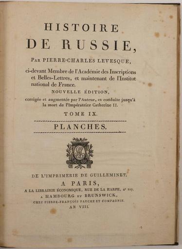 | Keywords: histoire de russie histoirederussie history of russia historyofrussia 1800 atlas levesque text document writing LEVESQUE, Pierre-Charles (1736-1812). Histoire de Russie [History of Russia]: Atlas Volume. Paris, Hamburg & Brunswick: l'Imprimerie de Guilleminet, Pierre-Francois Fauche, An VIII [1800]. Nouvelle Edition. Quarto. 16 pp. With a folding engraved outline hand colored map and sixteen engraved plates (many folding). Handsome period brown gilt tooled quarter calf with red gilt lettered morocco labels and marbled boards. Occasional very mild foxing, otherwise a very good copy. Atlas to the third edition of Histoire de Russie (earlier editions were published without separate atlas). The folding map drawn by A. Brue shows European Russia and the Caucasus. The plates depict views, temples and buildings mostly of the region of Volga, Ural Mountains and Kirghiz steppes. Among them are the ruins of the ancient city of Bolghar and of the mysterious Buddhist monastery Ablaikit in vicinity of Ust-Kamenogorsk in modern Kazakhstan. Ablaikit was built by a Kalmyk khan in 1654-1656 and was destroyed in 1670. At the beginning of the 18th century there were still sculptures and pictures in the monastery's temple. Manuscripts found there in 1720 were sent to Saint Petersburg. The plates include a general view, topographical plan and interior view of the temple of Ablaikit. Costumes of Kasimov Tatars, Samoyeds, Ostiaks, Mordvinians, Kalmyks, Tshouvach, Mongols and Kirghiz are also included. Pierre Charles Levesque was a French historian, philosopher and moralist, initially engraver. He lived in Russia for seven years working as a teacher in the Cadet Corps and the Imperial Academy of Arts in Saint Petersburg. His "Histoire de Russie" was recognized as the most significant research on Russian history written by a foreign scientist in the 18th century. It was widely popular in Russia before Nikolai Karamzin published his famous work, and kept its scientific significance until the end of the 19th century. Levesque was the first author who based his work mostly on Russian sources and historical works. For his achievements Levesque was accepted as a member of Académie des Inscriptions et Belles-letters (1789) and taught history in Collège de France (Nouvelle Biographie Générale, vol. 31, 38-39). www.wayfarersbookshop.com/show_details.php?txtBOOK=514 LEVESQUE, Pierre-Charles (1736-1812). Histoire de Russie [History of Russia]: Atlas Volume. Paris, Hamburg & Brunswick: l'Imprimerie de Guilleminet, Pierre-Francois Fauche, An VIII [1800]. Nouvelle Edition. Quarto. 16 pp. With a folding engraved outline hand colored map and sixteen engraved plates (many folding). Handsome period brown gilt tooled quarter calf with red gilt lettered morocco labels and marbled boards. Occasional very mild foxing, otherwise a very good copy. Atlas to the third edition of Histoire de Russie (earlier editions were published without separate atlas). The folding map drawn by A. Brue shows European Russia and the Caucasus. The plates depict views, temples and buildings mostly of the region of Volga, Ural Mountains and Kirghiz steppes. Among them are the ruins of the ancient city of Bolghar and of the mysterious Buddhist monastery Ablaikit in vicinity of Ust-Kamenogorsk in modern Kazakhstan. Ablaikit was built by a Kalmyk khan in 1654-1656 and was destroyed in 1670. At the beginning of the 18th century there were still sculptures and pictures in the monastery's temple. Manuscripts found there in 1720 were sent to Saint Petersburg. The plates include a general view, topographical plan and interior view of the temple of Ablaikit. Costumes of Kasimov Tatars, Samoyeds, Ostiaks, Mordvinians, Kalmyks, Tshouvach, Mongols and Kirghiz are also included. Pierre Charles Levesque was a French historian, philosopher and moralist, initially engraver. He lived in Russia for seven years working as a teacher in the Cadet Corps and the Imperial Academy of Arts in Saint Petersburg. His "Histoire de Russie" was recognized as the most significant research on Russian history written by a foreign scientist in the 18th century. It was widely popular in Russia before Nikolai Karamzin published his famous work, and kept its scientific significance until the end of the 19th century. Levesque was the first author who based his work mostly on Russian sources and historical works. For his achievements Levesque was accepted as a member of Académie des Inscriptions et Belles-letters (1789) and taught history in Collège de France (Nouvelle Biographie Générale, vol. 31, 38-39). www.wayfarersbookshop.com/show_details.php?txtBOOK=514 |