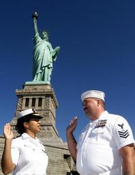 Keywords: liberty island libertyisland ny outdoor 000707-N-1110A-506.Everyone raises their right hand as Ensign Maria Navarro (left) administers the oath of re-enlistment to Petty Officer 1st Class John Carruthers at the base of the Statue of Liberty on Liberty Island, New York, on July 7, 2000. Navarro and Carruthers are two of over 25,000 international sailors and Marines from 20 countries in New York for International Naval Review 2000, a week-long event billed as a Celebration of Seapower for the Millennium. Navarro and Carruthers are stationed aboard the Ticonderoga Class Cruiser USS Hue City (CG 66). DoD photo by Petty Officer 1st Class Tina M. Ackerman, U.S. Navy. (Released). 000707-N-1110A-506.Everyone raises their right hand as Ensign Maria Navarro (left) administers the oath of re-enlistment to Petty Officer 1st Class John Carruthers at the base of the Statue of Liberty on Liberty Island, New York, on July 7, 2000. Navarro and Carruthers are two of over 25,000 international sailors and Marines from 20 countries in New York for International Naval Review 2000, a week-long event billed as a Celebration of Seapower for the Millennium. Navarro and Carruthers are stationed aboard the Ticonderoga Class Cruiser USS Hue City (CG 66). DoD photo by Petty Officer 1st Class Tina M. Ackerman, U.S. Navy. (Released). 000707-N-1110A-506.Everyone raises their right hand as Ensign Maria Navarro (left) administers the oath of re-enlistment to Petty Officer 1st Class John Carruthers at the base of the Statue of Liberty on Liberty Island, New York, on July 7, 2000. Navarro and Carruthers are two of over 25,000 international sailors and Marines from 20 countries in New York for International Naval Review 2000, a week-long event billed as a Celebration of Seapower for the Millennium. Navarro and Carruthers are stationed aboard the Ticonderoga Class Cruiser USS Hue City (CG 66). DoD photo by Petty Officer 1st Class Tina M. Ackerman, U.S. Navy. (Released). ny libertyisland Defense.gov News Photo 000707-N-1110A-506.jpg en Everyone raises their right hand as Ensign Maria Navarro left administers the oath of re-enlistment to Petty Officer 1st Class John Carruthers at the base of the Statue of Liberty on Liberty Island New York on July 7 2000 Navarro and Carruthers are two of over 25 000 international sailors and Marines from 20 countries in New York for International Naval Review 2000 a week-long event billed as a Celebration of Seapower for the Millennium Navarro and Carruthers are stationed aboard the Ticonderoga Class Cruiser USS Hue City CG 66 000707-N-1110A-506 Navy http //www defense gov/photos/newsphoto aspx newsphotoid 2926 2000-07-07 en Petty Officer 1st Class Tina M Ackerman U S Navy PD-USGov-Military-Navy Defense gov news media for July 2000 Import by User Slick-o-bot/Defense gov News Photos Man and woman smiling Sailors from the United States Navy Exterior of the Statue of Liberty Ceremonies of the United States Navy July 2000 in New York 2000 in New York City Military people in 2000 Female sailors White clothing female White clothing male Photographs of standing people Sailor caps of the United States Navy People with ribbon bars Male soldiers Men and women at work