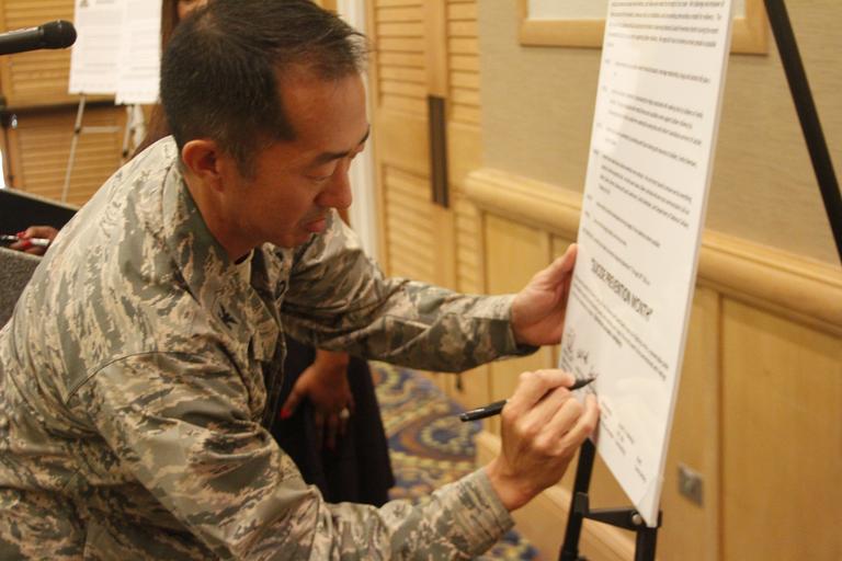 Keywords: pacific hawaii oahu army air force airforce navy marines coast guard coastguard fort shafter fortshafter hale ikeaa haleikeaa suicide prevention month suicidepreventionmonth 8th theater sustainment command 8ththeatersustainmentcommand 8th tsc 8thtsc 9th mission support command 9thmissionsupportcommand 9th msc 9thmsc joint services suicide prevention proclamation military jointservicessuicidepreventionproclamationmilitary u.s. us The first Joint Suicide Prevention Proclamation was signed by representatives from all five branches of the U.S. Military September 7 at the Hale Ikena on Fort Shafter, Hawaii. September is recognized throughout the nation as Suicide Prevention Month and is designed to help raise awareness about suicide and steps to prevent it. The proclamation signing was hosted by the 9th Mission Support Command in Hawaii (Photo by Spc. Jaime Ruiz, 8th TSC Public Affairs/RELEASED) The first Joint Suicide Prevention Proclamation was signed by representatives from all five branches of the U.S. Military September 7 at the Hale Ikena on Fort Shafter, Hawaii. September is recognized throughout the nation as Suicide Prevention Month and is designed to help raise awareness about suicide and steps to prevent it. The proclamation signing was hosted by the 9th Mission Support Command in Hawaii (Photo by Spc. Jaime Ruiz, 8th TSC Public Affairs/RELEASED) |