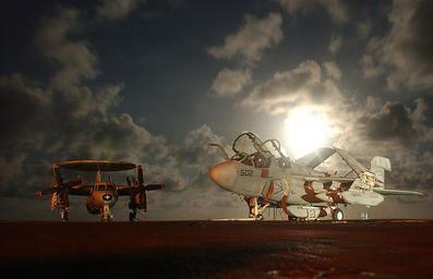 | Keywords: aircraft carrier cvn 73 cvn73 ea-6b ea6b flight deck flightdeck george washington georgewashington hawkeye scorpions tigertails outdoor 020923-N-1280S-001 At sea aboard USS George Washington (CVN 73) Sept. 23, 2002 -- An E-2C "Hawkeye" from the Tigertails of Airborne Early Warning Squadron One Two Five (VAW-125) and an EA-6B "Prowler" from the Scorpions of the Tactical Electronic Warfare Squadron One Three Two (VAQ-132) stand ready on the flight deck at night. The "Hawkeye" is an all-weather, tactical warning and control system aircraft that provides command and control functions for the battle group. The "Prowler" is a twin-engine aircraft used to provide an umbrella of protection for strike aircraft by jamming enemy radar, electronic data links and communications. VAW-125 and George Washington are based in Norfolk, Va. VAQ- 132 is based in Whidbey Island, Wa. The George Washington is participating in Exercise Mediterranean Shark during a scheduled six-month deployment, which has included combat missions in support of Operations Enduring Freedom and Southern Watch. Exercise Mediterranean Shark is a bilateral training exercise conducted in Morocco by a U.S. Marine Expeditionary Unit MEU/SOC (Special Operations Capable), to show the effectiveness of the Marine Air Ground Task Force (MAGTF). The MAGTF allows commands to task organized surface and air assets for use in meeting specific ends. U.S. Navy photo by Photographer's Mate Airman Lindsay Switzer. 020923-N-1280S-001 At sea aboard USS George Washington (CVN 73) Sept. 23, 2002 -- An E-2C "Hawkeye" from the Tigertails of Airborne Early Warning Squadron One Two Five (VAW-125) and an EA-6B "Prowler" from the Scorpions of the Tactical Electronic Warfare Squadron One Three Two (VAQ-132) stand ready on the flight deck at night. The "Hawkeye" is an all-weather, tactical warning and control system aircraft that provides command and control functions for the battle group. The "Prowler" is a twin-engine aircraft used to provide an umbrella of protection for strike aircraft by jamming enemy radar, electronic data links and communications. VAW-125 and George Washington are based in Norfolk, Va. VAQ- 132 is based in Whidbey Island, Wa. The George Washington is participating in Exercise Mediterranean Shark during a scheduled six-month deployment, which has included combat missions in support of Operations Enduring Freedom and Southern Watch. Exercise Mediterranean Shark is a bilateral training exercise conducted in Morocco by a U.S. Marine Expeditionary Unit MEU/SOC (Special Operations Capable), to show the effectiveness of the Marine Air Ground Task Force (MAGTF). The MAGTF allows commands to task organized surface and air assets for use in meeting specific ends. U.S. Navy photo by Photographer's Mate Airman Lindsay Switzer. |