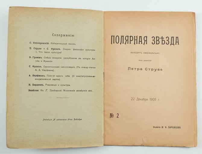 Keywords: Полярная Звезда. №02. (1905) — Титул. лист и содерж.jpg Титульный лист и ст аница соде жания жу нала «Поля ная Звезда» 2 1905 «Поля ная Звезда» еженедельный жу нал выходивший под ед П Ст уве с 15 декаб я 1905 г по 19 ма та 1906 г Всего вышло 14 номе ов 1905 http //www ebay ca/itm/1905-Imperial-Russia-Russian-Magazine-by-Petr-Struve-2-/181726991932 Редакто Пёт Бе нга дович Ст уве PD-RusEmpire Polyarnaya zvezda 1905 1906 Title pages uploaded by Steven Pavlov from various sources