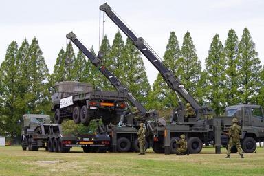 Keywords: 重レッカ03.JPG ja エンジンを破損した73式大型トラックを2台の重レッカで吊り上げる合い吊り 業 投稿 自身が撮影 Trans5885 2011-10-02 Type 74 truck Military tow trucks