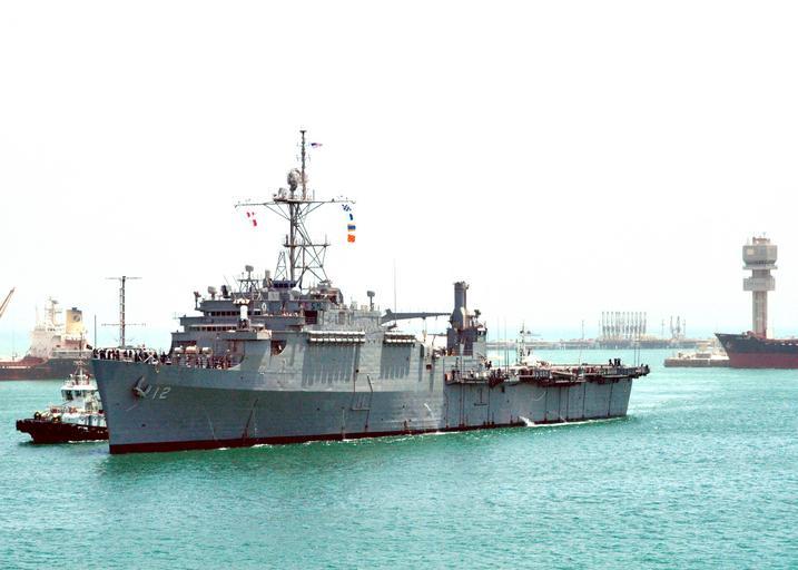 Ash Shuaybah, Kuwait, August 8, 2004 ñ Amphibious transport ship USS Shreveport (LPD 12) arrives in port in Kuwait, joining amphibious warfare ship USS Wasp (LHD 1) to backload Marines and cargo attached to the 22nd Marine Expeditionary Unit (Special Operations Capable). Wasp, Shreveport, and 22 MEU have been deployed since February as part of Expeditionary Strike Group 2 in support of the Global War on Terrorism. U.S. Navy photo by Photographerís Mate 3rd Class Teresa J. Ellison. (RELEASED)