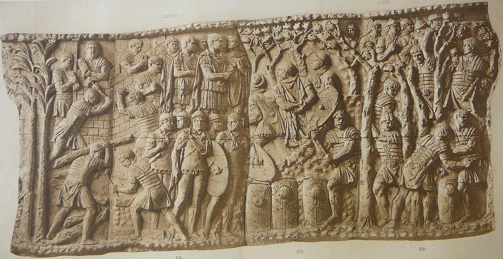| Keywords: 049 Conrad Cichorius, Die Reliefs der Traianssäule, Tafel XLIX.jpg attributed to Graphics Die Reliefs der Traianssäule nach Conrad Cichorius Tafel XLIX Einbringung eines Gefangenen Szene LXVIII ; Arbeitende Legionäre im Wald Szene LXIX The Reliefs of Trajan's Column by Conrad Cichorius Plate number XLIX A prisoner is brought in Scene LXVIII ; Legionaries wood-clearing Scene LXIX Sculpture AD 113 ; Graphics 1896 Sculpture bas-relief; Graphics monochrome graphics based on photographs Sculpture Institution Trajan's Column object history credit line accession number Conrad Cichorius Die Reliefs der Traianssäule Erster Tafelband Die Reliefs des Ersten Dakischen Krieges Tafeln 1-57 Verlag von Georg Reimer Berlin 1896 other versions 1932 Trajan's Column - Cichorius Plates |