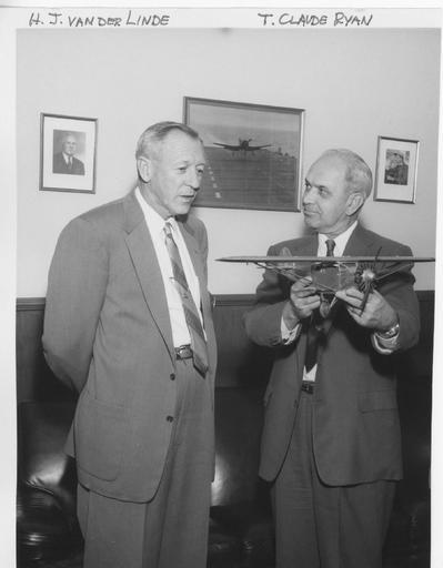 Keywords: sdasm aviation aeronautics san diego air and space museum sandiegoairandspacemuseum ryan lindbergh tc ryan tcryan aviator tubal claude ryan tubalclauderyan t. claude ryan tclauderyan claude ryan clauderyan john van der linde johnvanderlinde johnny van der linde johnnyvanderlinde van der linde vanderlinde monochrome blackandwhite indoor black and white T. Claude Ryan Ryan and long-term employee H.J. van der Linde. With model Spirit marking the 25th anniversary of the Lindbergh flight. Repository: San Diego Air and Space Museum Archive T. Claude Ryan Ryan and long-term employee H.J. van der Linde. With model Spirit marking the 25th anniversary of the Lindbergh flight. Repository: San Diego Air and Space Museum Archive |
