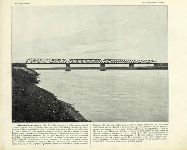 | Keywords: 061 Железный мост через р Кию.jpg en «Great Path - Views of Siberia and Great Siberian Railway» book 1899 ru Альбом «Великий путь Виды Сиби и и Великой сиби ской железной до оги» 1899 1899 flickr photos by I R Tomaskiewicz comments by V A I-v Custom license marker 2014 04 08 PD-RusEmpire PD-old Great Path - Views of Siberia and Great Siberian Railway Kiya River Bridges in Kemerovo Oblast Mariinsk 1890s bridges in Russia Railway bridges in Russia Iron truss bridges in Russia Uploaded with UploadWizard |
