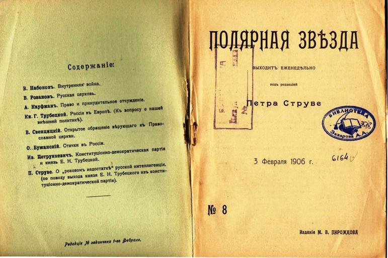 | Keywords: Полярная Звезда. №08. (1906) — Титул. лист и оглавл.jpg Титульный лист и оглавление жу нала «Поля ная Звезда» 8 1906 «Поля ная Звезда» еженедельный жу нал выходивший под ед П Ст уве с 15 декаб я 1905 г по 19 ма та 1906 г Всего вышло 14 номе ов 1906 http //xn--80aagr1bl7a net/index php md books to art id 4429 Редакто Пёт Бе нга дович Ст уве PD-RusEmpire Polyarnaya zvezda 1905 1906 Title pages uploaded by Steven Pavlov from various sources | ||||