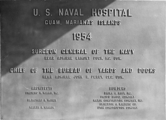 | Keywords: blackandwhite text monochrome writing black and white 09-5030-60 U.S. Naval Hospital. Dedication plaque. "1954 Surgeon General of the Navy Rear Admiral Lamont Pugh, Medical Corps, U.S. Navy; Chief of the Bureau of Yards and Docks Rear Admiral John R. Perry, CEC [Civil Engineer Corps?], U.S. Navy; Architects Frederic R. Harris, Inc., Blanchard and Maher, Keller and Gannon; Builders Brown and Root, Inc., Pacific Bridge Company, Maxon Construction Company, Inc., Swinerton and Walberg Co., Utah Construction Company." [Scene.] Guam, Marianas Islands, 11/29/1954; VU-5-7794-11-54. 09-5030-60 U.S. Naval Hospital. Dedication plaque. "1954 Surgeon General of the Navy Rear Admiral Lamont Pugh, Medical Corps, U.S. Navy; Chief of the Bureau of Yards and Docks Rear Admiral John R. Perry, CEC [Civil Engineer Corps?], U.S. Navy; Architects Frederic R. Harris, Inc., Blanchard and Maher, Keller and Gannon; Builders Brown and Root, Inc., Pacific Bridge Company, Maxon Construction Company, Inc., Swinerton and Walberg Co., Utah Construction Company." [Scene.] Guam, Marianas Islands, 11/29/1954; VU-5-7794-11-54. |