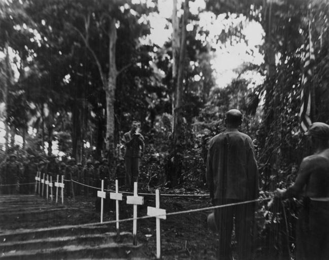 | Keywords: chaplains religion blackandwhite monochrome outdoor black and white 09-7938-002 U.S. Marines on Bougainville Island in the Solomons after the beachhead was established. With the firing squad standing in the background, chaplain conducts services for men who died and are buried where they fought their last fight. Heavy rain fell during the service. 05/18/1945; BuAer 203002 09-7938-002 U.S. Marines on Bougainville Island in the Solomons after the beachhead was established. With the firing squad standing in the background, chaplain conducts services for men who died and are buried where they fought their last fight. Heavy rain fell during the service. 05/18/1945; BuAer 203002 |