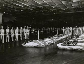 Keywords: 09-7938-010 U.S.S. Hancock services "One-Two Punch." Hit and set aflame by a bomb and the crash of the Jap plane which loosed the bomb, the Navy carrier U.S.S. Hancock was stunned and shaken - but resumed limited operations within 4 hours. Shrouded in flags, the bodi[es of the dead await burial on the hanger deck]. 08/20/1945; File Number 328570. [World War II, Kamikaze, Battle of Okinawa]. 09-7938-010 U.S.S. Hancock services "One-Two Punch." Hit and set aflame by a bomb and the crash of the Jap plane which loosed the bomb, the Navy carrier U.S.S. Hancock was stunned and shaken - but resumed limited operations within 4 hours. Shrouded in flags, the bodi[es of the dead await burial on the hanger deck]. 08/20/1945; File Number 328570. [World War II, Kamikaze, Battle of Okinawa].