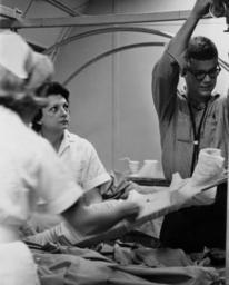 | Keywords: blackandwhite people monochrome black and white 09-7976-14 ComSeventhFleet Det 'C'. Hospitalman 3rd Class Thomas K. Johnstone, 22, of Greenvile, South Carolina, puts a Marine's broken leg in traction at the Naval Hospital at Danang, South Vietnam as 2 nurses stand by to assist. [Splints (Surgery). Orthopedic apparatus.] [Vietnam War.] [Scene.] Vietnam - Treating Casualties and Patients. 07/30/1968; VNT-17345D-6-68; Photograph by PH1 Donald F. Grantham. 09-7976-14 ComSeventhFleet Det 'C'. Hospitalman 3rd Class Thomas K. Johnstone, 22, of Greenvile, South Carolina, puts a Marine's broken leg in traction at the Naval Hospital at Danang, South Vietnam as 2 nurses stand by to assist. [Splints (Surgery). Orthopedic apparatus.] [Vietnam War.] [Scene.] Vietnam - Treating Casualties and Patients. 07/30/1968; VNT-17345D-6-68; Photograph by PH1 Donald F. Grantham. |