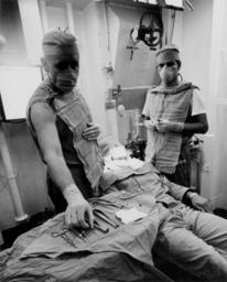 | Keywords: blackandwhite monochrome indoor black and white 09-7976-16 ComSeventhFlt Det "C". Lieutenant Commander John S. Lindsay (left) an oral surgeon from Schnectady, New York, performs a tooth extraction in the dental clinic operating room on the hospital ship Repose off Vietnam. Assisting him is dental technician 3rd Class Robert C. Bubon, 22 of Moline, Illinois, a qualified operating room technician who reported to Repose in 08/1965, before the ship's recommissioning for service in the combat zone. [Hospital ships. Transport of sick and wounded.] [Dentistry.] [Vietnam War.] [Scene.] Vietnam - Treating Casualties and Patients. 10/06/1967; VNT-16461-A-10-67; by JOC Robert D. Moeser, USN. 09-7976-16 ComSeventhFlt Det "C". Lieutenant Commander John S. Lindsay (left) an oral surgeon from Schnectady, New York, performs a tooth extraction in the dental clinic operating room on the hospital ship Repose off Vietnam. Assisting him is dental technician 3rd Class Robert C. Bubon, 22 of Moline, Illinois, a qualified operating room technician who reported to Repose in 08/1965, before the ship's recommissioning for service in the combat zone. [Hospital ships. Transport of sick and wounded.] [Dentistry.] [Vietnam War.] [Scene.] Vietnam - Treating Casualties and Patients. 10/06/1967; VNT-16461-A-10-67; by JOC Robert D. Moeser, USN. |
