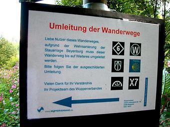 Keywords: 0,26 km Umleitung.jpg Teilstrecke 1a Wuppertal Beyenburg - Remscheid-Lennep 0 26 km Umleitung Участок 1а Вуппе таль-Байенбу г - Ремшайд-Леннеп 0 26 км В еменный обход в связи с еконст укцией плотины август 2009 Own 2009-08-29 Velopilger Jakobsweg Teilstrecke 1a Wuppertal Beyenburg - Remscheid-Lennep Hiking and footpath signs in Ennepetal Wupperverband Signs of Way of Saint James in North Rhine-Westphalia