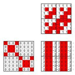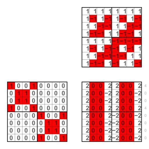 Keywords: 1001 0000 Walsh spectrum.svg Walsh spectra of 3-ary Boolean functions like 1001 0000 The binary strings are multiplied with a Walsh matrix of order 8 The red squares in the background are additional information and show the product of the binary strings with a binary Walsh matrix own Lipedia Walsh spectrum of 3-ary Boolean functions |
