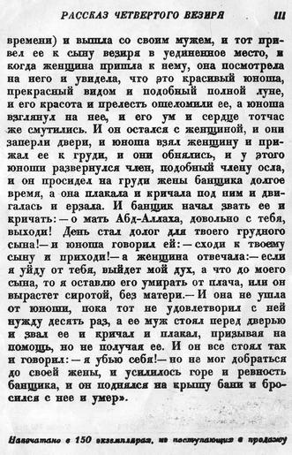 Keywords: 1001 Nights-Russian censored version-page III.tif A censored portion with erotic content from the Russian translation of One Thousand and One Nights This text was omitted in the 5th volume of One Thousand and One Nights published by Academia publishing house Academia in 1933 night 584 Electronic copy 1933 Unknown folk tales PD-old-100 Text pages Censorship in the Soviet Union Arabian Nights Book censorship |