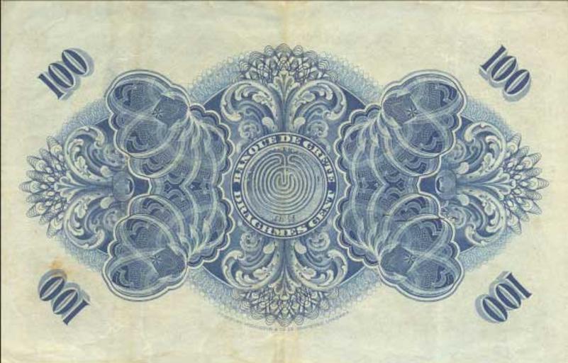 | Keywords: 100 drachmas banknote, Cretan State, back view.jpg  el Πίσω όψη του χαρτονομίσματος των 100 δραχμών της Κρητικής Πολιτείας en 100 drachmas banknote Cretan State back view 1901 1917 http //www greekbanknotes com/greek-banknotes/bank_of_crete/ author other versions Custom license marker 2016 07 02 PD-old PD-1923 Cretan state banknotes |