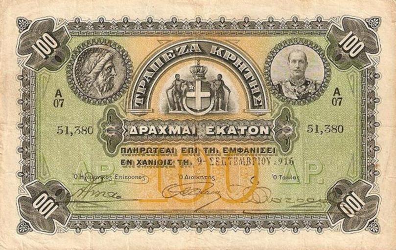 | Keywords: 100 drachmas banknote, Cretan State, front view.jpg  el Έμ ροσθεν όψη του χαρτονομίσματος των 100 δραχμών της Κρητικής Πολιτείας en 100 drachmas banknote Cretan State front view 1901 1917 http //www greekbanknotes com/greek-banknotes/bank_of_crete/ author other versions Custom license marker 2016 07 02 PD-old PD-1923 Cretan state banknotes |
