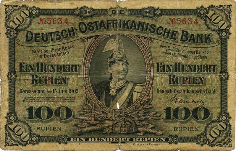 | Keywords: 100 Rupien de l'Afrique de l'Est édités sous domination allemande le 15 juin 1905.jpg en 100 Rupien de l'Afrique de l'Est édités sous domination allemande le 15 juin 1905 2013-12-19 11 16 19 http //www cgb fr/100-rupien-afrique-de-lest-occ-allemande-1905-p-04 b52_0387 a html cgb cc-by-sa-3 0 PD-old Banknotes of German East Africa Banknotes with a face value of 100 | ||||