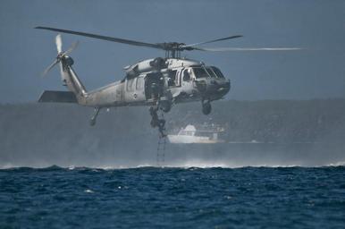 Keywords: 101213-N-5539C-001 (5267304785).jpg 101213-N-5539C-001 SANTA RITA Guam Dec 13 2010 A Marine assigned to 3rd Reconnaissance Battalion Okinawa Japan climbs a rope ladder to an MH-60S Sea Hawk helicopter assigned to Helicopter Sea Combat Squadron HSC 25 during helocast training as part of exercise Sandfisher with the Singapore Armed Forces at U S Naval Base Guam Sandfisher is an annual training exercise in which III Marine Expeditionary Force Force Reconnaissance Company conducts bilateral amphibious reconnaissance and combat diving training with the Singapore Armed Forces Naval Dive Unit U S Navy photo by Mass Communication Specialist 2nd Class Corwin Colbert/Released https //www flickr com/photos/39955793 N07/5267304785/ 101213-N-5539C-001 2009-03-24 02 17 https //www flickr com/people/39955793 N07 U S Department of Defense Current Photos PD-USGov U S Department of Defense Current Photos https //flickr com/photos/39955793 N07/5267304785 2016-09-03 15 54 05 United States Government Work Rope ladders People climbing ladders MH-60S Seahawk 3rd Reconnaissance Battalion United States Helicopter Sea Combat Squadron 25 United States Navy Naval Base Guam