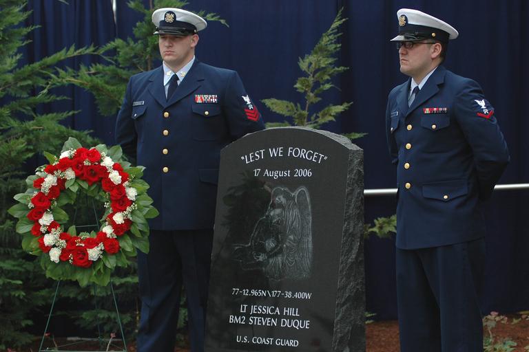Keywords: 1083801 HEALY MEMORIAL of USCG Fallen Divers LT. Jessica Hill and PO2 Steven Duque.jpg en SEATTLE - Coast Guard District 13 unveiled the Coast Guard Healy Diver Memorial here today in remembrance of LT Jessica Hill and Petty Officer 2 nd Class Steven Duque who lost their lives in an unfortunate accident a year ago during dive operations in the Arctic Ocean approximately 500 miles north of Barrow Ala Official Coast Guard photo by Petty Officer 3rd Class David R Marin 2007-08-17 11 46 41 https //www dvidshub net/image/1083801/healy-memorial Official Coast Guard photo by Petty Officer 3rd Class David R Marin other versions PD-USGov Coast Guard in Alaska People wearing military uniforms Funerals Gravestones |