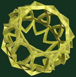 Keywords: mathematica 3d cg parametricplot3d texture torus code program algorithm プログラム コード アルゴリズム 輪環 りんかん ドーナツ どーなつ 五芒星 ごぼうせい geometric sculpture geometricsculpture shape geometry sculpture mapping テクスチャ マッピング 模様 もよう abstract 抽象 ちゅうしょう アブストラクト design pattern デザイン パターン graphic グラフィック グラフィクス structure 意匠 構造 symmetry 対称性 たいしょうせい シンメトリー 対称 たいしょう plant foliage outdoor leaf a = 8; (* center hole size *) b = 5; (* penta-torus *) c = -18; (* distance from the center of rotation *) d = 10; (* number of torus *) h = 2; (* height of a torus *) SetOptions[ParametricPlot3D, PlotRange -> Full, Mesh -> None, Boxed -> False, Axes -> False, PlotPoints -> 400, ImageSize -> 3000, Background -> RGBColor[{20, 50, 30}/255], PlotStyle -> Directive[Specularity[White, 30], Texture[Import["D:/tmp/71.jpg"]]], TextureCoordinateFunction -> ({#4, #5 Pi} &), Lighting -> "Neutral"]; f[v_] := TriangleWave[{-1, 1}, v/(2 Pi)]; g[v_] := TriangleWave[{-1, 1}, v/(2 Pi) + 1/4]; x = (a - g[t] - f[b s]) Cos[s + 3 Pi/(4 b)]; y = (a - g[t] - f[b s]) Sin[s + 3 Pi/(4 b)]; z = (a - f[t] - h f[b s]) + c; rm = Table[{x, y, z}.RotationMatrix[2 i Pi/d, {1, 1, 0}], {i, d}]; ParametricPlot3D[rm, {t, 0, 2 Pi}, {s, 0, Pi}] (*--- The Texture *) a = 8; (* center hole size *) b = 5; (* penta-torus *) c = -18; (* distance from the center of rotation *) d = 10; (* number of torus *) h = 2; (* height of a torus *) SetOptions[ParametricPlot3D, PlotRange -> Full, Mesh -> None, Boxed -> False, Axes -> False, PlotPoints -> 400, ImageSize -> 3000, Background -> RGBColor[{20, 50, 30}/255], PlotStyle -> Directive[Specularity[White, 30], Texture[Import["D:/tmp/71.jpg"]]], TextureCoordinateFunction -> ({#4, #5 Pi} &), Lighting -> "Neutral"]; f[v_] := TriangleWave[{-1, 1}, v/(2 Pi)]; g[v_] := TriangleWave[{-1, 1}, v/(2 Pi) + 1/4]; x = (a - g[t] - f[b s]) Cos[s + 3 Pi/(4 b)]; y = (a - g[t] - f[b s]) Sin[s + 3 Pi/(4 b)]; z = (a - f[t] - h f[b s]) + c; rm = Table[{x, y, z}.RotationMatrix[2 i Pi/d, {1, 1, 0}], {i, d}]; ParametricPlot3D[rm, {t, 0, 2 Pi}, {s, 0, Pi}] (*--- The Texture *) |