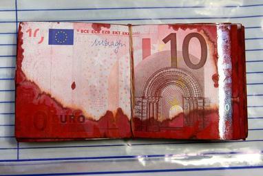 Keywords: 10 euro notes from an ATM robbery.jpg en With red paint made ‹ ‹unusable ‚¬ 10 bills from a cash machine robbery 2012-08-11 own Cruks cc-by-sa-3 0 Money-EU Uploaded with UploadWizard 10 euro banknotes Crime prevention Red