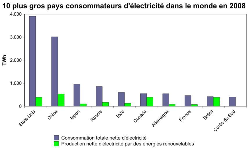Keywords: 10 pays monde consommateurs électricité.svg fr 10 plus gros pays consommateurs d'électricité dans le monde en 2008 Production nette d'électricité par des énergies renouvelables par rapport à la consommation totale nette d'électricité http //www eia gov/countries/data cfm EIA Lery007 2011-03-24 Cc-zero Renewable energy statistics |