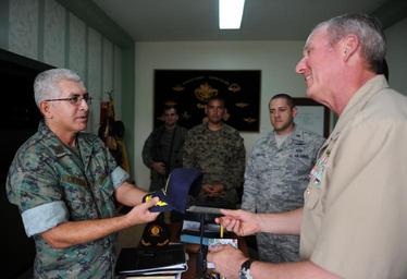 Keywords: 110112-N-2984R-442 (5354392287).jpg U S Navy Cmdr Mark Becker right the mission commander for Southern Partnership Station 2011 right presents Ecuadorian Capitan de Fragata Dario Ortega Perez a ball cap during a visit to Base Naval de Jaramijo where a Marine Corps Training and Advisory Group team is holding a week-long exercise in support of Southern Partnership Station 2011 in Manta Ecuador Jan 12 2011 Southern Partnership Station is an annual deployment of U S ships to the U S Southern Command area of responsibility in the Caribbean and Latin America The exercise involves information sharing and training with navies coast guards and civilian services throughout the region DoD photo by Mass Communication Specialist 2nd Class Ricardo J Reyes U S Navy/Released https //www flickr com/photos/39955793 N07/5354392287/ 110112-N-2984R-442 2011-01-03 17 54 https //www flickr com/people/39955793 N07 U S Department of Defense Current Photos PD-USGov U S Department of Defense Current Photos https //flickr com/photos/39955793 N07/5354392287 2016-09-03 15 31 27 United States Government Work Manta Ecuador Navy people of Ecuador Southern Partnership Station 2011 |