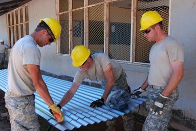 Keywords: 110725-A-PH759-324 (5988128162).jpg From left U S Army Spc Weston Blasius Spc Waylon Blasius and Sgt Kirk Surat measure and cut steel roofing material at the Pater van der Pluym School in Paramaribo Suriname July 25 2011 The Soldiers were participating in New Horizons Suriname a U S Southern Command-directed joint humanitarian and civic assistance mission deploying U S military engineers veterinarians medics and other professions to Suriname for training construction projects and to provide humanitarian and medical services DoD photo by Spc Manda Walters U S Army/Released https //www flickr com/photos/39955793 N07/5988128162/ 110725-A-PH759-324 2011-07-25 11 53 https //www flickr com/people/39955793 N07 U S Department of Defense Current Photos PD-USGov U S Department of Defense Current Photos https //flickr com/photos/39955793 N07/5988128162 2016-09-03 13 52 00 United States Government Work New Horizons 2011 Paramaribo South Dakota South Dakota Army National Guard Suriname United States Department of Defense |