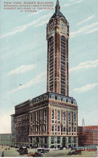 | Keywords: singer tower architecture building outdoor skyscraper skyline The Singer Building or Singer Tower, at Liberty Street and Broadway in Lower Manhattan's Financial District, was a 47-story office building completed in 1908 as the headquarters of the Singer Manufacturing Company.[4] It was the tallest building in the world from 1908 to 1909. It was demolished in 1968, together with the adjacent City Investing Building, and is now the site of 1 Liberty Plaza. When it was demolished, it was the tallest building ever to be demolished. When you think of tall buildings you probably don’t think a building 612 feet tall is all that important. In 1906 it was considered a staggering height, as a building that size had never been built before. The Singer Building or Singer Tower, at Liberty Street and Broadway in Lower Manhattan's Financial District, was a 47-story office building completed in 1908 as the headquarters of the Singer Manufacturing Company.[4] It was the tallest building in the world from 1908 to 1909. It was demolished in 1968, together with the adjacent City Investing Building, and is now the site of 1 Liberty Plaza. When it was demolished, it was the tallest building ever to be demolished. When you think of tall buildings you probably don’t think a building 612 feet tall is all that important. In 1906 it was considered a staggering height, as a building that size had never been built before. |