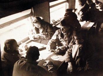 Keywords: 127-GW-230-227322: Dining car table gave ideal setting for a gin rummy game for Marines and two Red Cross girls. Photographed by Staff Sergeant R.O. Keppler, North China, February 22, 1946. (5/5/2015). 127-GW-230-227322: Dining car table gave ideal setting for a gin rummy game for Marines and two Red Cross girls. Photographed by Staff Sergeant R.O. Keppler, North China, February 22, 1946. (5/5/2015). |