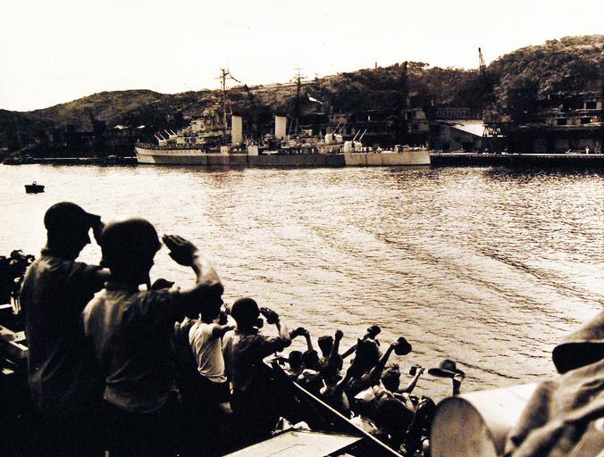 | Keywords: 127-GW-244-139135: Kirvn Harbor. Royal Navy light cruiser seen from USS Thomas E. Gary (DE 326) as she passes by with Prisoners of War (mostly British and Australian). The American sailors and Marines salute as they pass while the British prisoners cheer and wave at their countrymen, September 6, 1945. (5/5/2015). 127-GW-244-139135: Kirvn Harbor. Royal Navy light cruiser seen from USS Thomas E. Gary (DE 326) as she passes by with Prisoners of War (mostly British and Australian). The American sailors and Marines salute as they pass while the British prisoners cheer and wave at their countrymen, September 6, 1945. (5/5/2015). |