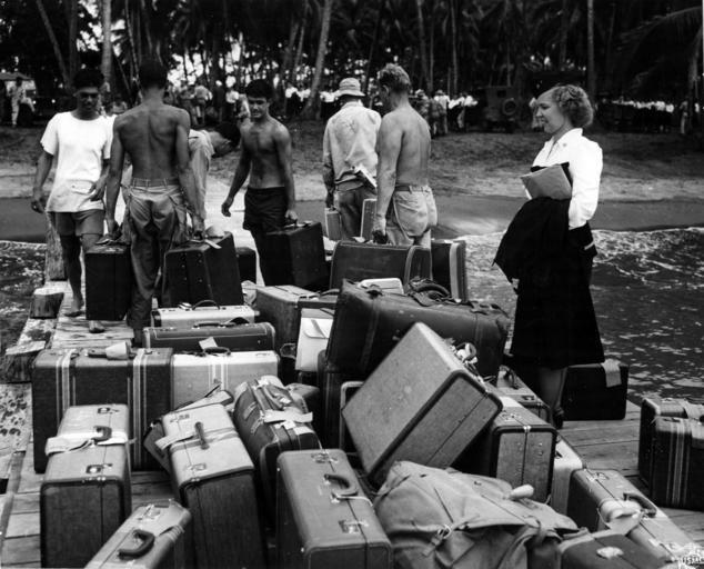 | Keywords: blackandwhite monochrome outdoor black and white Arrival - For the fifty Navy nurses arriving on Guadalcanal there is no absence of porters to move their luggage. Marines and others are quck to aid the women. Ensign Jean Rogers, of 5800 Garfield Avenue, Kansas City, MO seks her suitcases among the pile just after she disembarked from a landing craft. [World War II; South Pacific]. Probably taken on May 3, 1944 by Staff SGT G.R. Gass. Hdqtrs No. 77,582. Navy Medicine Historical Files Collection - Facilities - Mobile Hospital #8. 12-0280-005 Arrival - For the fifty Navy nurses arriving on Guadalcanal there is no absence of porters to move their luggage. Marines and others are quck to aid the women. Ensign Jean Rogers, of 5800 Garfield Avenue, Kansas City, MO seks her suitcases among the pile just after she disembarked from a landing craft. [World War II; South Pacific]. Probably taken on May 3, 1944 by Staff SGT G.R. Gass. Hdqtrs No. 77,582. Navy Medicine Historical Files Collection - Facilities - Mobile Hospital #8. 12-0280-005 |