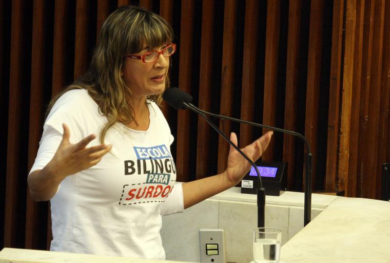| Keywords: sessão plenária sessãoplenária sueli fernandes suelifernandes indoor Professora Sueli Fernandes, da Federação Nacional de Educação e Integração dos Surdos (Feneis/PR), em pronunciamento na sessão plenária desta segunda-feira (12/09). De acordo com a professora, o que se vê, na escola proposta pelo MEC, é a inserção de crianças surdas, em geral, sem contato prévio com nenhuma língua, nem português nem Libras, em salas onde o meio de instrução é o português. O evento atendeu a uma proposição do deputado Professor Lemos (PT), que considera fundamental o debate, especialmente para que a população adquira consciência e respeite a pessoa surda. Foto: Nani Gois/Alep (crédito obrigatório) Professora Sueli Fernandes, da Federação Nacional de Educação e Integração dos Surdos (Feneis/PR), em pronunciamento na sessão plenária desta segunda-feira (12/09). De acordo com a professora, o que se vê, na escola proposta pelo MEC, é a inserção de crianças surdas, em geral, sem contato prévio com nenhuma língua, nem português nem Libras, em salas onde o meio de instrução é o português. O evento atendeu a uma proposição do deputado Professor Lemos (PT), que considera fundamental o debate, especialmente para que a população adquira consciência e respeite a pessoa surda. Foto: Nani Gois/Alep (crédito obrigatório) |
