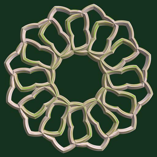 Keywords: mathematica 3d cg parametricplot3d texture torus code program algorithm プログラム コード アルゴリズム 輪環 りんかん ドーナツ どーなつ 五芒星 ごぼうせい geometric sculpture geometricsculpture shape geometry sculpture mapping テクスチャ マッピング 模様 もよう abstract 抽象 ちゅうしょう アブストラクト design pattern デザイン パターン graphic グラフィック グラフィクス structure 意匠 構造 symmetry 対称性 たいしょうせい シンメトリー 対称 たいしょう tangle organic pattern black background a = 8; (* center hole size *) b = 5; (* penta-torus *) c = 12; (* distance from the center of rotation *) d = 12; (* number of torus *) h = 0; (* height of a torus *) SetOptions[ParametricPlot3D, PlotRange -> Full, Mesh -> None, Boxed -> False, Axes -> False, PlotPoints -> 400, ImageSize -> 3000, Background -> RGBColor[{20, 50, 30}/255], PlotStyle -> Directive[Specularity[White, 70], Texture[Import["D:/tmp/862.jpg"]]], TextureCoordinateFunction -> ({#4 + #5, #5 / Pi} &), Lighting -> "Neutral"]; f[v_] := TriangleWave[{-1, 1}, v/(2 Pi)]; g[v_] := TriangleWave[{-1, 1}, v/(2 Pi) + 1/4]; x = (a - g[t] - f[b s]) Cos[s] + c; y = (a - g[t] - f[b s]) Sin[s] + c; z = (a - f[t] - h f[b s]); rm = Table[{x, y, z}.RotationMatrix[2 i Pi/d, {0, 0, 1}], {i, d}]; ParametricPlot3D[rm, {t, 0, 2 Pi}, {s, 0, Pi}] (*--- The Texture *) a = 8; (* center hole size *) b = 5; (* penta-torus *) c = 12; (* distance from the center of rotation *) d = 12; (* number of torus *) h = 0; (* height of a torus *) SetOptions[ParametricPlot3D, PlotRange -> Full, Mesh -> None, Boxed -> False, Axes -> False, PlotPoints -> 400, ImageSize -> 3000, Background -> RGBColor[{20, 50, 30}/255], PlotStyle -> Directive[Specularity[White, 70], Texture[Import["D:/tmp/862.jpg"]]], TextureCoordinateFunction -> ({#4 + #5, #5 / Pi} &), Lighting -> "Neutral"]; f[v_] := TriangleWave[{-1, 1}, v/(2 Pi)]; g[v_] := TriangleWave[{-1, 1}, v/(2 Pi) + 1/4]; x = (a - g[t] - f[b s]) Cos[s] + c; y = (a - g[t] - f[b s]) Sin[s] + c; z = (a - f[t] - h f[b s]); rm = Table[{x, y, z}.RotationMatrix[2 i Pi/d, {0, 0, 1}], {i, d}]; ParametricPlot3D[rm, {t, 0, 2 Pi}, {s, 0, Pi}] (*--- The Texture *) |