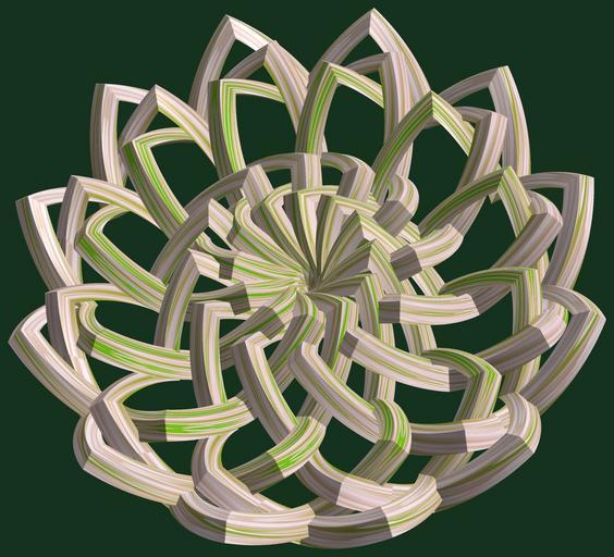 Keywords: mathematica 3d cg parametricplot3d texture torus code program algorithm プログラム コード アルゴリズム 輪環 りんかん ドーナツ どーなつ 五芒星 ごぼうせい geometric sculpture geometricsculpture shape geometry sculpture mapping テクスチャ マッピング 模様 もよう abstract 抽象 ちゅうしょう アブストラクト design pattern デザイン パターン graphic グラフィック グラフィクス structure 意匠 構造 symmetry 対称性 たいしょうせい シンメトリー 対称 たいしょう wheel tangle black background a = 8; (* center hole size *) b = 5; (* penta-torus *) c = 6; (* distance from the center of rotation *) d = 12; (* number of torus *) h = 3; (* height of a torus *) SetOptions[ParametricPlot3D, PlotRange -> Full, Mesh -> None, Boxed -> False, Axes -> False, PlotPoints -> 400, ImageSize -> 3000, Background -> RGBColor[{20, 50, 30}/255], PlotStyle -> Directive[Specularity[White, 50], Texture[Import["D:/tmp/862.jpg"]]], TextureCoordinateFunction -> ({#4 + #5, #5 / Pi} &), Lighting -> "Neutral"]; f[v_] := TriangleWave[{-1, 1}, v/(2 Pi)]; g[v_] := TriangleWave[{-1, 1}, v/(2 Pi) + 1/4]; x = (a - g[t] - f[b s]) Cos[s] + c; y = (a - g[t] - f[b s]) Sin[s] + c; z = (a - f[t] - h f[b s]); rm = Table[{x, y, z}.RotationMatrix[2 i Pi/d, {0, 0, 1}], {i, d}]; ParametricPlot3D[rm, {t, 0, 2 Pi}, {s, 0, Pi}] (*--- The Texture *) a = 8; (* center hole size *) b = 5; (* penta-torus *) c = 6; (* distance from the center of rotation *) d = 12; (* number of torus *) h = 3; (* height of a torus *) SetOptions[ParametricPlot3D, PlotRange -> Full, Mesh -> None, Boxed -> False, Axes -> False, PlotPoints -> 400, ImageSize -> 3000, Background -> RGBColor[{20, 50, 30}/255], PlotStyle -> Directive[Specularity[White, 50], Texture[Import["D:/tmp/862.jpg"]]], TextureCoordinateFunction -> ({#4 + #5, #5 / Pi} &), Lighting -> "Neutral"]; f[v_] := TriangleWave[{-1, 1}, v/(2 Pi)]; g[v_] := TriangleWave[{-1, 1}, v/(2 Pi) + 1/4]; x = (a - g[t] - f[b s]) Cos[s] + c; y = (a - g[t] - f[b s]) Sin[s] + c; z = (a - f[t] - h f[b s]); rm = Table[{x, y, z}.RotationMatrix[2 i Pi/d, {0, 0, 1}], {i, d}]; ParametricPlot3D[rm, {t, 0, 2 Pi}, {s, 0, Pi}] (*--- The Texture *) |