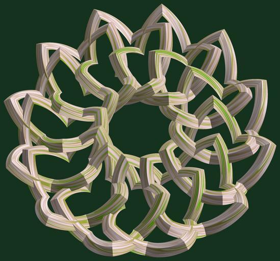 | Keywords: mathematica 3d cg parametricplot3d texture torus code program algorithm プログラム コード アルゴリズム 輪環 りんかん ドーナツ どーなつ 四芒星 しぼうせい geometric sculpture geometricsculpture shape geometry sculpture mapping テクスチャ マッピング 模様 もよう abstract 抽象 ちゅうしょう アブストラクト design pattern デザイン パターン graphic グラフィック グラフィクス structure 意匠 構造 symmetry 対称性 たいしょうせい シンメトリー 対称 たいしょう tangle black background organic pattern indoor a = 6; (* center hole size *) b = 4; (* tetra-torus *) c = 8; (* distance from the center of rotation *) d = 12; (* number of torus *) h = 3; (* height of a torus *) SetOptions[ParametricPlot3D, PlotRange -> Full, Mesh -> None, Boxed -> False, Axes -> False, PlotPoints -> 400, ImageSize -> 3000, Background -> RGBColor[{20, 50, 30}/255], PlotStyle -> Directive[Specularity[White, 70], Texture[Import["D:/tmp/862.jpg"]]], TextureCoordinateFunction -> ({#4 + #5, #5 / Pi} &), Lighting -> "Neutral"]; f[v_] := TriangleWave[{-1, 1}, v/(2 Pi)]; g[v_] := TriangleWave[{-1, 1}, v/(2 Pi) + 1/4]; x = (a - g[t] - f[b s]) Cos[s] + c; y = (a - g[t] - f[b s]) Sin[s] + c; z = (a - f[t] - h f[b s]); rm = Table[{x, y, z}.RotationMatrix[2 i Pi/d, {0, 0, 1}], {i, d}]; ParametricPlot3D[rm, {t, 0, 2 Pi}, {s, 0, Pi}] (*--- The Texture *) a = 6; (* center hole size *) b = 4; (* tetra-torus *) c = 8; (* distance from the center of rotation *) d = 12; (* number of torus *) h = 3; (* height of a torus *) SetOptions[ParametricPlot3D, PlotRange -> Full, Mesh -> None, Boxed -> False, Axes -> False, PlotPoints -> 400, ImageSize -> 3000, Background -> RGBColor[{20, 50, 30}/255], PlotStyle -> Directive[Specularity[White, 70], Texture[Import["D:/tmp/862.jpg"]]], TextureCoordinateFunction -> ({#4 + #5, #5 / Pi} &), Lighting -> "Neutral"]; f[v_] := TriangleWave[{-1, 1}, v/(2 Pi)]; g[v_] := TriangleWave[{-1, 1}, v/(2 Pi) + 1/4]; x = (a - g[t] - f[b s]) Cos[s] + c; y = (a - g[t] - f[b s]) Sin[s] + c; z = (a - f[t] - h f[b s]); rm = Table[{x, y, z}.RotationMatrix[2 i Pi/d, {0, 0, 1}], {i, d}]; ParametricPlot3D[rm, {t, 0, 2 Pi}, {s, 0, Pi}] (*--- The Texture *) |