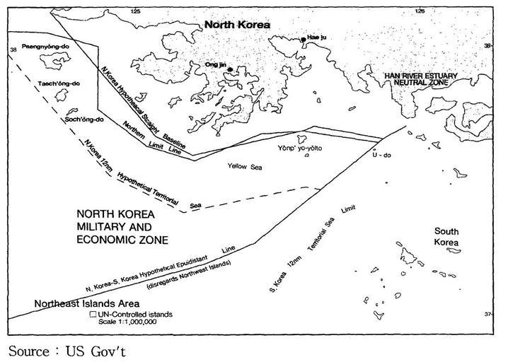 | Keywords: 12nm hypothetical Territorial Sea compared with Northern Limit Line, North Korea.jpg en A US Government map showing where a North Korean 12 nautical mile Territorial Waters limit would be when disregarding the north west UN Command islands compared to the UN Command created Northern Limit Line http //118 129 184 33/pub/docu/kr/AM/06/AM062001B01/IMAGE/AM06-2001-B01-0210-01 jpg US Government date Map taken from HTML version of the paper which included this US Government credited map cite journal http //www kmi re kr/data/linksoft/admin/yun_un/up_file/opr161-06 pdf http //118 129 184 33/pub/docu/kr/AM/06/AM062001B01/AM06-2001-B01-006 HTM http //www kmi re kr/paper/oceanpolicy_view asp pub_idx 7093 pub_paper_idx 13792 Seong-Geol Hong Sun-Pyo Kim Hyung-Ki Lee 2001-06-30 Fisheries Cooperation and Maritime Delimitation Issues between North Korea and Its Neighboring Countries Ocean Policy Research 16 1 191-216 Korea Maritime Institute 2010-11-28 HTML version of paper http //118 129 184 33/pub/docu/kr/AM/06/AM062001B01/AM06-2001-B01-006 HTM According to a Korean Central News Agency article Northern Limit Line rejected of 2 August 2002http //www kcna co jp/item/2002/200208/news08/02 htm 14 the U S government distributed this map to the participants in the UN conference on maritime law held in the U S in 1980 The map is also published in a paper by John Barry Kotch and Michael Abbey in http //www asianperspective org/articles/v27n2-f pdf Asian Perspective Vol 27 No 2 2003 pp 175-204 The CIA report The West Coast Korean Islands BGI RP 74-9 January 1974 Declassified 2000-04-18 as CIA-RDP-84-00825R000300120001-7 http //www kpajournal com/declassified-documents-old/The 20West 20Coast 20Islands 20January 201974 pdf describes this or a very similar map However the map itself is redacted from the declassified version of the report PD-USGov Maps of Korea Yellow Sea |