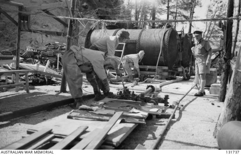 Keywords: 131737 THESE TANKS, EACH HOLDING 5 TONS, ARE BEACH-HEAD RESERVOIRS IN WHICH MUSTARD GAS IS STORED PRIOR TO ITS TRANSFERENCE BY PIPELINE TO TANKS ON LANDING SHIP, TANK (LST).jpg en OKUNOSHIMA JAPAN THESE TANKS EACH HOLDING 5 TONS ARE BEACH-HEAD RESERVOIRS IN WHICH MUSTARD GAS IS STORED PRIOR TO ITS TRANSFERENCE BY PIPELINE TO TANKS ON LANDING SHIP TANK LST FEEDER PIPE AND VALVES FOR ADJUSTING FLOW ARE IN FOREGROUND SHOWN MAJOR W E WILLIAMSON CHEMICAL WARFARE SECTION UNITED STATES ARMY CENTRE WITH JAPANESE WORKMEN ON THE RIGHT IS BRIGADIER G H CLIFTON 1946-08-03 131737 Queale Alan other versions Custom license marker 2016 07 12 Copyright expired - public domain PD-AustraliaGov Chemical weapons in Okunoshima 1946-1947