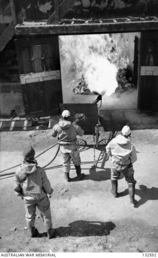 | Keywords: 132592 JAPANESE WORKMEN WEARING GAS-MASKS DIRECTED JETS FROM A MOBILE FLAME-THROWER TOWARDS THE PILE OF GASOLINE-SOAKED DEBRIS INSIDE THE BUILDING AND WITHIN A MATTER OF SECONDS THE INTERIOR OF THE BUILDING WAS A RAGING INFERNO.JPG en OKUNOSHIMA JAPAN JAPANESE WORKMEN WEARING GAS-MASKS DIRECTED JETS FROM A MOBILE FLAME-THROWER TOWARDS THE PILE OF GASOLINE-SOAKED DEBRIS INSIDE THE BUILDING AND WITHIN A MATTER OF SECONDS THE INTERIOR OF THE BUILDING WAS A RAGING INFERNO THE MUSTARD GAS PLANT FRENCH PATT OF THE TOKYO 2ND ARMY ARSENAL SITUATED ON OKUNOSHIMA ISLAND OF THE INLAND SEA WAS BEING DECONTAMINATED BY FIRE THE DESTRUCTION OF THE POISON GAS ON THE ISLAND WAS COMPLETED SEVERAL MONTHS AGO PRIOR TO BURNING THE INTERIOR OF THE LARGE CONCRETE AND BRICK BUILDING WAS STACKED WITH PILES OF GASOLINE-SOAKED DEBRIS THE WORK OF DECONTAMINATION WAS CARRIED OUT BY THE TEIKOKU RAYON COMPANY UNDER CONTRACT FROM THE JAPANESE GOVERNMENT AND UNDER SUPERVISION OF THE DISPOSAL ENEMY EQUIPMENT SECTION BCOF DEE SEC 132592 Queale Alan 1947-03-20 Copyright expired - public domain PD-AustraliaGov Chemical weapons in Okunoshima 1946-1947 British Commonwealth Occupation Force |