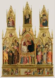 Keywords: 1370 - 1415) - Polyptych with Coronation of the Virgin and Saints - Google Art Project.jpg Institution Getty Center active 1369/1370 - 1415 2788282 Cenni di Francesco di Ser Cenni Italian Florentine Italian /collection/the-j-paul-getty-museum/artwork/polyptych-with-coronation-of-the-virgin-and-saints-cenni-di-francesco-di-ser-cenni-italian-florentine-active-13691370-1415/2786307/ Cenni di Francesco di Ser Cenni Italian Florentine active 1369/1370 - 1415 artist /artist/cenni-di-francesco-di-ser-cenni-fl1369-1415/5901644/ 5901644 /collection/the-j-paul-getty-museum/ Getty Center 343005 http //www getty edu/museum 3/2/2012 12 45 42 PM /collection/the-j-paul-getty-museum/artwork/polyptych-with-coronation-of-the-virgin-and-saints-cenni-di-francesco-di-ser-cenni-italian-florentine-active-13691370-1415/2786307/ 1390 about 1390s Coats of Arms Archangel Gabriel Archangel Michael Christ Child Demons Saint Agnes Saint Apollonia Saint Catherine Saint Lucy Saint Margaret of Antioch Saint Mary Magdalene Saint Ursula Saint Ambrose Saint Andrew Saint Anthony Abbot Saint Bartholomew Saint Benedict Saint James the Greater Saint John Gualbert Saint John the Baptist Saint Lawrence Saint Michael Saint Nicholas Saint Peter Saint Stephen Saint Zenobius Annunciation Coronation of the Virgin Madonna and Child Saint Bernard of Clairvaux Saint John the Evangelist Religion Tempera and gold leaf on panel True 3556 2786307 True 1399 3/25/2012 4 12 32 AM lido getty edu-gm-obj646 http //www getty edu/art/gettyguide/artObjectDetails artobj 646 http //www getty edu/legal/copyright html Painting 1390 1400 Florence Italy Creation w2391 x h3556 cm about 1390s False 0 697265625 Object polyptych-with-coronation-of-the-virgin-and-saints-cenni-di-francesco-di-ser-cenni-italian-florentine-active-13691370-1415 Polyptych with Coronation of the Virgin and Saints p 2391 Tempera and gold leaf on panel Coats of Arms Archangel Gabriel Archangel Michael Christ Child Demons Saint Agnes Saint Apollonia Saint Catherine Saint Lucy Saint Margaret of Antioch Saint Mary Magdalene Saint Ursula Saint Ambrose Saint Andrew Saint Anthony Abbot Saint Bartholomew Saint Benedict Saint James the Greater Saint John Gualbert Saint John the Baptist Saint Lawrence Saint Michael Saint Nicholas Saint Peter Saint Stephen Saint Zenobius Annunciation Coronation of the Virgin Madonna and Child Saint Bernard of Clairvaux Saint John the Evangelist Religion http //www getty edu/legal/copyright html special url_id vAG2MQcuk7ipMQ PD-old-100 Google Art Project works by Cenni di Francesco di Ser Cenni Italian paintings of saints and the New Testament in the Getty Center Cenni Di Francesco Di Ser Cenni