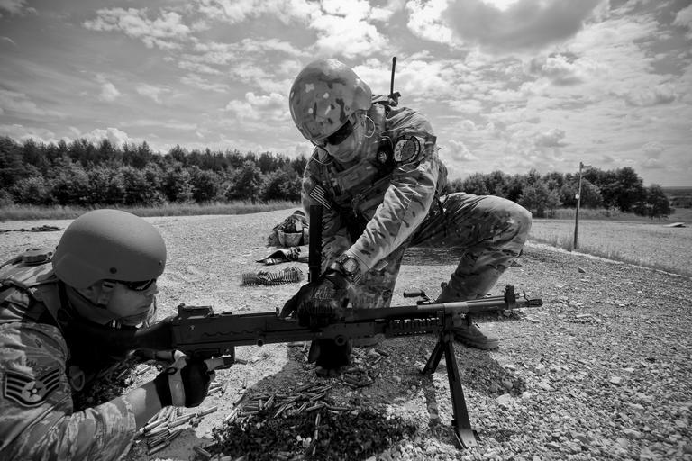 | Keywords: u.s. air force usairforce united states air force unitedstatesairforce usaf ang air combat command aircombatcommand acc air national guard airnationalguard 177th fighter wing 177thfighterwing operation kriegshammer operationkriegshammer exercise training grafenwoehr germany bavaria tacp tactical air control party tacticalaircontrolparty creative commons royalty free public domain photo photograph digital matt hecht getty reuters ap blackandwhite monochrome outdoor black and white U.S. Air Force Senior Airman Ken Faria from the New Jersey Air National Guard's 177th Fighter Wing assists a fellow Airmen with clearing an M240 machine gun at Grafenwoehr Training Area, Bavaria, Germany on July 15, 2014. (U.S. Air National Guard photo by Tech. Sgt. Matt Hecht/Released) U.S. Air Force Senior Airman Ken Faria from the New Jersey Air National Guard's 177th Fighter Wing assists a fellow Airmen with clearing an M240 machine gun at Grafenwoehr Training Area, Bavaria, Germany on July 15, 2014. (U.S. Air National Guard photo by Tech. Sgt. Matt Hecht/Released) |