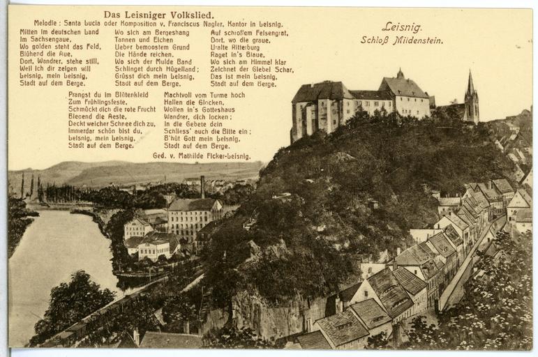 | Keywords: 14915-Leisnig-1912-Schloß Mildenstein-Brück & Sohn Kunstverlag.jpg Leisnig; Schloß Mildenstein Brück Sohn 14915 yes 1912 own Brück Sohn Kunstverlag Meißen cc-zero Burg Mildenstein Texts Postcards with lyrics Mulde Buildings in Leisnig 1912 postcards of Landkreis Mittelsachsen 1912 postcards published by Brück Sohn Postcards of Leisnig published by Brück Sohn Images from Brück Sohn Uploaded with VicuñaUploader | ||||