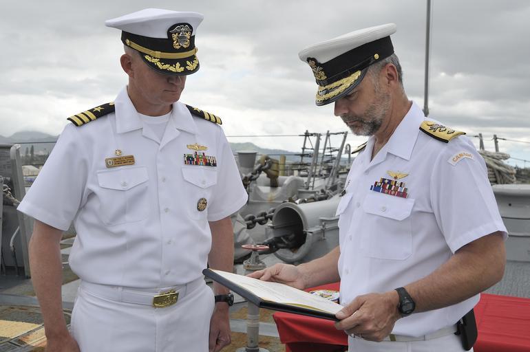 Keywords: 150526-N-IU636-068 Royal Canadian Navy Rear Adm. William Truelove, commander, Maritime Forces Pacific (MARPAC).jpg PEARL HARBOR May 26 2015 Royal Canadian Navy Rear Adm William Truelove commander Maritime Forces Pacific MARPAC prepares to present Cmdr Todd E Hutchison commanding officer of the guided-missile destroyer USS Michael Murphy DDG 112 with the Canadian Forces ™ Unit Commendation while aboard Michael Murphy at Joint Base Pearl Harbor-Hickam Truelove also presented Rear Adm Rick Williams commander of Navy Region Hawaii and Naval Surface Group Middle Pacific with the Canadian Forces ™ Unit Commendation The commendation was given in appreciation for the recovery efforts of Her Majesty ™s Canadian Ship HMCS Protecteur after suffering an engine fire several hundred miles off the coast of Hawaii during its transit back to Esquimalt British Columbia in February 2014 U S Navy photo by Mass Communication Specialist 2nd Class Johans Chavarro/Released https //www flickr com/photos/compacflt/18210397292/ 150526-N-IU636-068 2015-05-26 00 00 https //www flickr com/people/43397645 N06 U S Pacific Fleet Petty Officer 2nd Class Johans Chavarro/Navy Public Affairs Support Element Detachment Hawaii U S Navy photo PD-USGov-Military-Navy William Truelove Aboard USS Michael Murphy DDG-112 Admirals of Canada |