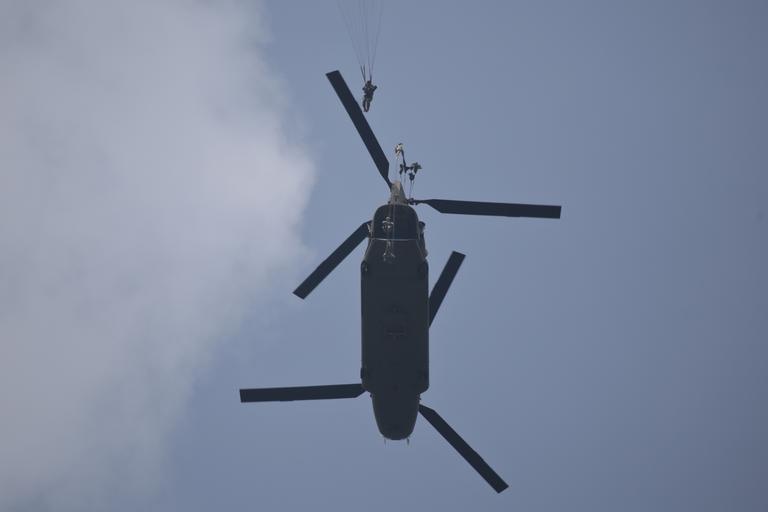 Keywords: usa usaf u.s. air force usairforce united states air force unitedstatesairforce air national guard airnationalguard air force airforce ang acc u.s. army usarmy reserve 227th air support operations squadron 227thairsupportoperationssquadron 227th asos 227thasos national guard nationalguard nj njang new jersey air national guard newjerseyairnationalguard new jersey national guard newjerseynationalguard airborne jump training maryland army national guard marylandarmynationalguard soldier airman airmen joint training jointtraining tacp jtac army national guard armynationalguard 404th civil affairs battalion 404thcivilaffairsbattalion civil affairs civilaffairs joint base mdl jointbasemdl joint base mcguire-dix-lakehurst jointbasemcguiredixlakehurst ch-47 ch47 chinook helicopter air assault airassault aviation helo chopper military photo combat training combattraining public domain royalty free getty reuters ap monochrome aerial outdoor U.S. Army Reserve Soldiers from the 404th Civil Affairs Battalion (Airborne) and Tactical Air Control Party Airmen from the New Jersey Air National Guard's 227th Air Support Operations Squadron jump from a CH-47 Chinook helicopter from the Maryland Army National Guard at Scorpion Drop Zone on Joint Base McGuire-Dix-Lakehurst, N.J., June 12, 2015. (U.S. Air National Guard photo by Tech. Sgt. Matt Hecht/Released) U.S. Army Reserve Soldiers from the 404th Civil Affairs Battalion (Airborne) and Tactical Air Control Party Airmen from the New Jersey Air National Guard's 227th Air Support Operations Squadron jump from a CH-47 Chinook helicopter from the Maryland Army National Guard at Scorpion Drop Zone on Joint Base McGuire-Dix-Lakehurst, N.J., June 12, 2015. (U.S. Air National Guard photo by Tech. Sgt. Matt Hecht/Released)