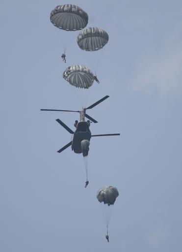 | Keywords: usa usaf u.s. air force usairforce united states air force unitedstatesairforce air national guard airnationalguard air force airforce ang acc u.s. army usarmy reserve 227th air support operations squadron 227thairsupportoperationssquadron 227th asos 227thasos national guard nationalguard nj njang new jersey air national guard newjerseyairnationalguard new jersey national guard newjerseynationalguard airborne jump training maryland army national guard marylandarmynationalguard soldier airman airmen joint training jointtraining tacp jtac army national guard armynationalguard 404th civil affairs battalion 404thcivilaffairsbattalion civil affairs civilaffairs joint base mdl jointbasemdl joint base mcguire-dix-lakehurst jointbasemcguiredixlakehurst ch-47 ch47 chinook helicopter air assault airassault aviation helo chopper military photo combat training combattraining public domain royalty free getty reuters ap outdoor monochrome U.S. Army Reserve Soldiers from the 404th Civil Affairs Battalion (Airborne) and Tactical Air Control Party Airmen from the New Jersey Air National Guard's 227th Air Support Operations Squadron jump from a CH-47 Chinook helicopter from the Maryland Army National Guard at Scorpion Drop Zone on Joint Base McGuire-Dix-Lakehurst, N.J., June 12, 2015. (U.S. Air National Guard photo by Tech. Sgt. Matt Hecht/Released) U.S. Army Reserve Soldiers from the 404th Civil Affairs Battalion (Airborne) and Tactical Air Control Party Airmen from the New Jersey Air National Guard's 227th Air Support Operations Squadron jump from a CH-47 Chinook helicopter from the Maryland Army National Guard at Scorpion Drop Zone on Joint Base McGuire-Dix-Lakehurst, N.J., June 12, 2015. (U.S. Air National Guard photo by Tech. Sgt. Matt Hecht/Released) |