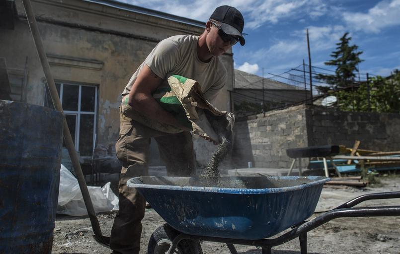 Keywords: eucom hca humanitarian civic assistance humanitariancivicassistance 435th af georgia tbilisi 435th agow 435thagow 435th cts 435thcts construction usaf usafe renovations building partnership capacity buildingpartnershipcapacity nato united helping nations helpingnations airmen school gymnasium u.s. military engineers usmilitaryengineers europe georgian army georgianarmy u.s. army civil engineers usarmycivilengineers gori outdoor U.S. Air Force Airman 1st Class Cole Kasten, 52nd Civil Engineer Squadron pavement and heavy equipment operator, mixes cement for a ramp at Public School No. 4 in Gori, Georgia, Aug. 28, 2015. Kasten and a team of U.S. Air Force Airmen built the ramp to give disabled students at the school safe access into the gymnasium. Humanitarian and Civic Assistance projects enhance operational readiness of military personnel while providing mutual support to the host nation's population. (U.S. Air Force photo/Staff Sgt. Sara Keller) U.S. Air Force Airman 1st Class Cole Kasten, 52nd Civil Engineer Squadron pavement and heavy equipment operator, mixes cement for a ramp at Public School No. 4 in Gori, Georgia, Aug. 28, 2015. Kasten and a team of U.S. Air Force Airmen built the ramp to give disabled students at the school safe access into the gymnasium. Humanitarian and Civic Assistance projects enhance operational readiness of military personnel while providing mutual support to the host nation's population. (U.S. Air Force photo/Staff Sgt. Sara Keller)