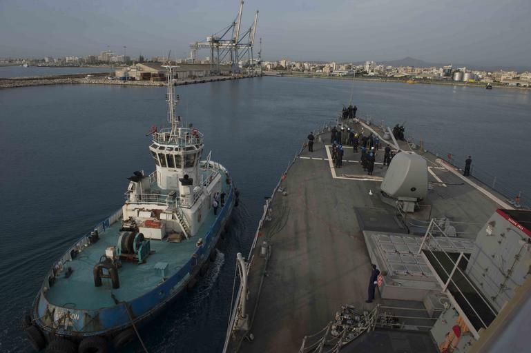 | Keywords: us navy usnavy navy mc navymc npase-east npaseeast navy public affairs navypublicaffairs sailors europe 6th fleet 6thfleet uss donald cook (ddg 75) ussdonaldcookddg75 mediterranean sea mediterraneansea patrol snmg2 nato active endeavour activeendeavour larnaca cyprus boat vehicle outdoor 151013-N-TC720-119 LARNACA, Cyprus (Oct. 13, 2015) a tugboat guides USS Donald Cook (DDG 75) to a pier in Larnaca, Cyprus, during a regularly scheduled port visit Oct. 13, 2015. Donald Cook, an Arleigh Burke-class guided-missile destroyer, forward deployed to Rota, Spain is conducting a routine patrol in the U.S. 6th Fleet area of operations in support of U.S. national security interests in Europe. (U.S. Navy photo by Mass Communication Specialist 3rd Class Mat Murch/Released) 151013-N-TC720-119 LARNACA, Cyprus (Oct. 13, 2015) a tugboat guides USS Donald Cook (DDG 75) to a pier in Larnaca, Cyprus, during a regularly scheduled port visit Oct. 13, 2015. Donald Cook, an Arleigh Burke-class guided-missile destroyer, forward deployed to Rota, Spain is conducting a routine patrol in the U.S. 6th Fleet area of operations in support of U.S. national security interests in Europe. (U.S. Navy photo by Mass Communication Specialist 3rd Class Mat Murch/Released) |