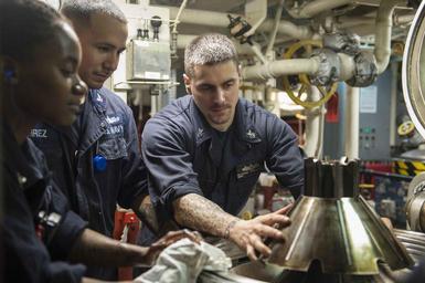 | Keywords: uss farragut ussfarragut csg 12 csg12 engine room engineroom fuel oil transfer fueloiltransfer u.s. 6th fleet us6thfleet mediterranean sea mediterraneansea people 151017-N-VC236-011 MEDITERRANEAN SEA (October 17, 2015) - Gas Turbine System Technician (Mechanical) 1st Class Matthew Copenheaver, from Baltimore, and Gas Turbine System Technicians (Mechanical) 3rd Class Michael Ramirez and Takesha Williams, both from Chicago, clean a fuel oil transfer purifier aboard the Arleigh Burke-class guided-missile destroyer USS Farragut (DDG 99) October 17, 2015. Farragut, homeported in Mayport, Florida, is conducting naval operations in the U.S. 6th Fleet area of operations in support of U.S. national security interests in Europe. (U.S. Navy photo by Mass Communication Specialist 3rd Class Jackie Hart/Released) 151017-N-VC236-011 MEDITERRANEAN SEA (October 17, 2015) - Gas Turbine System Technician (Mechanical) 1st Class Matthew Copenheaver, from Baltimore, and Gas Turbine System Technicians (Mechanical) 3rd Class Michael Ramirez and Takesha Williams, both from Chicago, clean a fuel oil transfer purifier aboard the Arleigh Burke-class guided-missile destroyer USS Farragut (DDG 99) October 17, 2015. Farragut, homeported in Mayport, Florida, is conducting naval operations in the U.S. 6th Fleet area of operations in support of U.S. national security interests in Europe. (U.S. Navy photo by Mass Communication Specialist 3rd Class Jackie Hart/Released) |