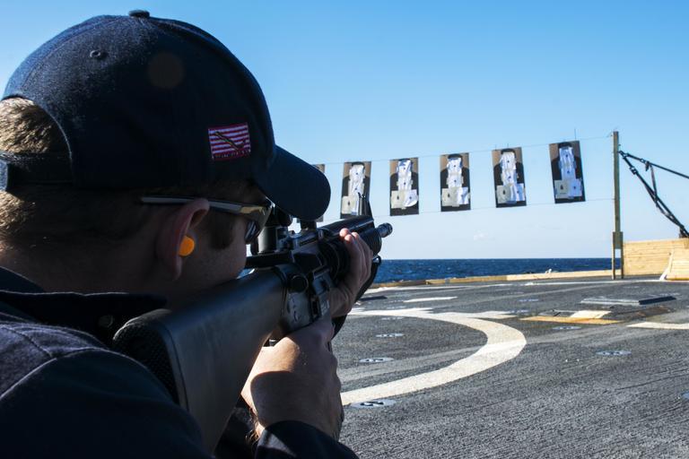 | Keywords: u.s. navy usnavy uss porter ussporter u.s. 6th fleet us6thfleet black sea blacksea outdoor 151025-N-AX546-123 BLACK SEA (Oct. 25, 2015) Fire Controlman 2nd Class Duke Batteate, from Hayward, Calif., takes aim with an M16 rifle on the flight deck of USS Porter (DDG 78) during a small arms qualification Oct. 25, 2015. Porter, an Arleigh Burke-class guided-missile destroyer, forward-deployed to Rota, Spain, is on a routine patrol conducting naval operations in the U.S. 6th Fleet area of operations in support of U.S. national security interests in Europe. (U.S. Navy photo by Mass Communication Specialist 1st Class Sean Spratt/Released) 151025-N-AX546-123 BLACK SEA (Oct. 25, 2015) Fire Controlman 2nd Class Duke Batteate, from Hayward, Calif., takes aim with an M16 rifle on the flight deck of USS Porter (DDG 78) during a small arms qualification Oct. 25, 2015. Porter, an Arleigh Burke-class guided-missile destroyer, forward-deployed to Rota, Spain, is on a routine patrol conducting naval operations in the U.S. 6th Fleet area of operations in support of U.S. national security interests in Europe. (U.S. Navy photo by Mass Communication Specialist 1st Class Sean Spratt/Released) |